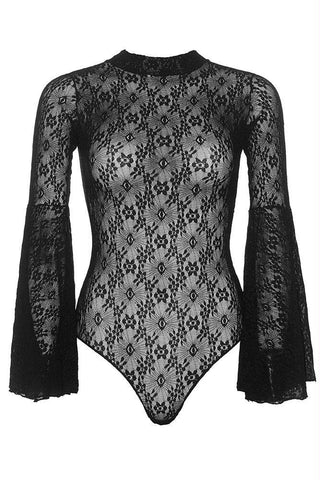 Dramatically detailed with bell sleeves, this black floral lace bodysuit is perfect to wear alone, or layer for the perfect eye catching piece. OS