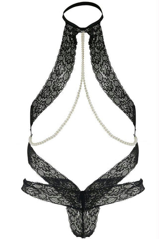 Leave little to the imagination in this sultry black teddy. Floral lace bands wrap the bodice with a choker style fit and contrasting white pearls. OS