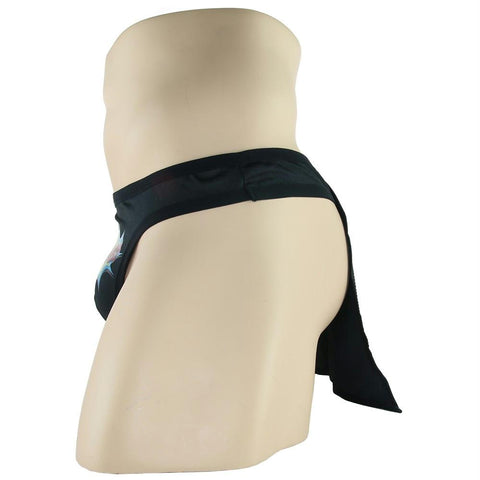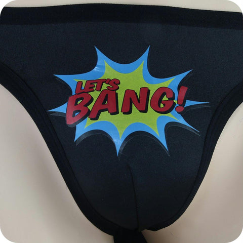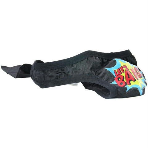 The black Let's Bang! Superhero Thong features comically bright print, a skimpy barely-there fit and a sexy little cape