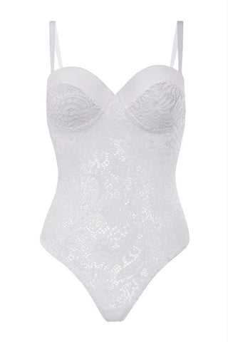 A beautiful crochet detailed piece in pure porcelain white, this romantic classic teddy is perfect for wedding night seduction. M