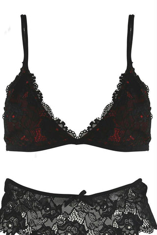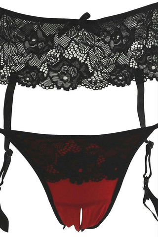 Red and Black Lace Bralette, Garter & Panty Set in M-L