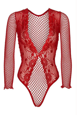 Tempt and tease, layered or not, this red, sheer fishnet teddy features a sexy, v-plunge neckline. OS