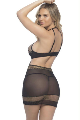This charming two piece includes a daring faux halter mini and matching black g-string panties. S/M