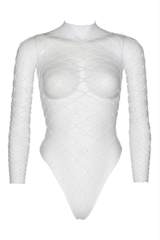 Slip into this barely there fence net bodysuit! A wide net in bright white features a high neck and long sleeves with a thong fit. OS